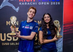 KARACHI: World junior champions Amina Orfi and Mohamad Zakaria cemented their status as one of the best squash players as they clinched the championship title at the Karachi Open on Sunday in front of a packed court that cheered on the two Egyptian teenagers on their path to victory. World number three Orfi was up against Malaysia’s Sivasangari Subramaniam, who she demolished 3-0 to take an expected victory with a scoreline of 11-8, 11-2, 11-7. “The final is never an easy match,” the 18-year-old said after her 38-minute match that saw her win her fourth title of the season. “Me and Siva have played several times this season, I know how dangerous she is; I just have to prepare in this sport very well. Thanks to the fans for supporting us, they’ve built the atmosphere and it made me happy to see the crowd here today cheering for both of us,” Orfi said.