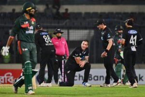 Towhid Hridoy kept Bangladesh in the hunt with a composed 55 off 59 balls, registering his 12th ODI half-century. He shared a steady stand with Afif Hossain, who was out for 27 while attempting a big hit off Jayden Lennox. With the required rate climbing, Tickner removed Mehidy Hasan Miraz before sending back Rishad Hossain and Shoriful Islam off successive balls in the 46th over. Tickner also got rid of Taskin Ahmed to ensure a fine win for the Kiwis with nine balls to spare. Earlier, Bangladesh bowlers produced a disciplined performance to restrict New Zealand to 247-8 after the visitors opted to bat first. Shoriful impressed on his return, removing Nick Kelly early and conceding just nine runs in his opening five overs. Shoriful was drafted in the squad at the last minute to replace Mustafizur Rahman, who has a knee injury. Nicholls anchored the New Zealand innings with a composed 68 and shared useful stands with Will Young (30) and Tom Latham (14) before falling to Rishad Hossain, who picked up two key wickets. Foxcroft’s aggressive 59 off 58 balls and Nathan Smith’s unbeaten 21 provided late impetus to the New Zealand innings.